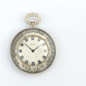 Taschenuhr, BERGLAND, "Olympische Spiele München 26.8.-10.9.1972", Silber 800/000, röm. Index, Handaufzug, D = 40,5 mm, Uhr läuft (Welle leicht verzogen, funktioniert, nicht beeinträchtigt)