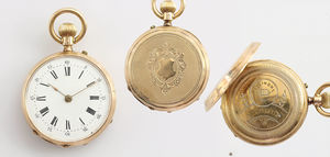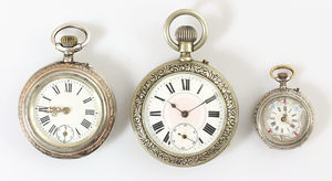 Lot: 2 Herrentaschenuhren, 1 x röm. Zahlen, kl. Sekunde auf 6 Uhr, Gehäuse komplett graviert, hinten Glasboden, D = 50,5 mm; 1 x REMONTOIR PATENT, Silber, röm. Zahlen, kl. Sekunde auf 6 Uhr, Gehäuse komplett graviert, rotgoldfarbener Rand, D = 36,5 mm; 1 x Damentaschenuhr, Silber, farbiges E.Z.Blatt, wappenförmig abgedeckt, röm. Zahlen, Gehäuse komplett graviert, D = 29,5 mm Krone lose !), alle Uhren laufen