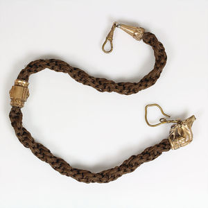 Haar-Uhrenkette, Ende 19.Jhd., Metall doubliert, ein Ende mit Hirschkopf u. Geweih, das andere Ende mit Karabiner, 1 Zierelement, L = 43,5, guter Originalzustand