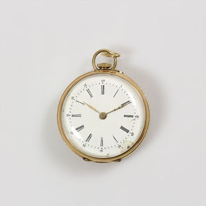 Zylinder-Damentaschenuhr, GG 585/000, E.Z.Blatt mit leichten Ausbesserungen, röm. Std. u. arab. Min. Index, D = 32 mm, Aufhängung nachträglich umgearb., Uhr läuft