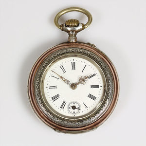 Herren-Taschenuhr, um 1900, Silber 800/000, E.Z.Blatt, ein Zeiger rep., röm. Index, kl. Sek. auf 6 Uhr (sehr klein), z.B. Metall, Systeme Glashütte, 10 Rubis, D = 47,5 mm, 2 Kupferfarb. Bänder um das Gehäuse, Rückseite graviert, Uhr läuft nicht ! Zum Uhrmacher !