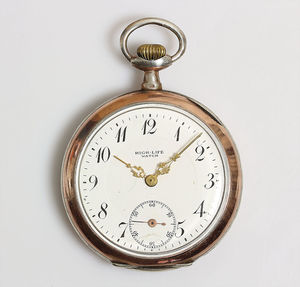 Herren-Zylindertaschenuhr, HIGH-LIFE WATCH, Silber 800/000, mit rotverg. Rand, Gehäuse hinten fein graviert, Brequetspirale, Z.B. Silber mit Gravur: E. H., feine Risse im E.Z., verg. Zeiger, arab. Zahlen, kl. Sek. auf 6 Uhr, D = 49,7 mm, Uhr läuft, Uhrglas lose !
