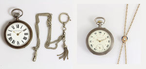 Lot: 2 Taschenuhren, 1 x INTERNATIONAL PRAECISIONS WATCH COMPANY, Metall. Stiftanker, hinten aufwendig graviert, Uhrenkette, D = 51 mm; 1 x CROISSANT, Zylinderhemmung, röm/arab Index, kl. Sekunde auf 6 Uhr (Std. Zeiger abgebrochen), D = 49 mmDouble-Uhrenkette, Uhren laufen