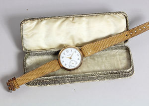 Damenarmbanduhr, RECTE, GG 585/000 (umgebaute Taschenuhr), E.Z.Blatt mit arab. Index, goldene Zeiger, kl. Sekunde auf 6 Uhr, Brequetspirale, D = 31,5 mm, mit alter Schatulle, Uhr läuft
