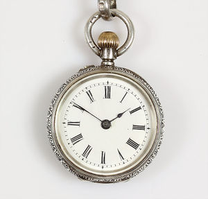 Damen-Zylindertaschenuhr, Silber 935/000, röm Zahlen, E.Z. Blatt, Gehäuse komplett graviert, D = 27,8 mm, Uhr läuft; Kette mit Karabiner, Silber, punziert mit Löwe O, Meisterpunze: J.R, L = 102 cm