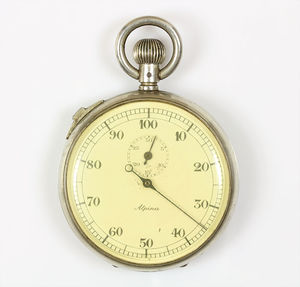 Stoppuhr, ALPINA, Metall, E.Z.Blatt mit arab. Zahlen, kl. Sekunde auf 12 Uhr, D = 51,5 mm, Uhr läuft
