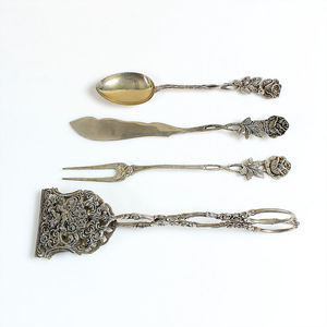 Lot: 4 Teile Rosenbesteck, Gebäckzange Silber 835/000 L = 16 cm; Buttermesser, Silber 800/000, L = 14,5 cm; Gabel, Silber 800/000, L = 14,7 cm; Kaffeelöffel, Silber 800/000, L = 12,5 cm; total 102 g