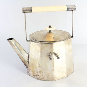 Teekanne, ART-DECO 20er Jahre, ENGLAND/AMERIKA ?, versilbert, gemarkt: B.E.P.W.F, Deckel mit Elfenbein, Kanne mit Kunststoffgriff, formschön u. hochwertig gearbeitet, Kanne für Ausgießgestell vorgesehen, H = 21,5 cm