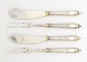 Lot 4 Teile, Ende 20.Jhd., Silber 800/000, mit graphisch floralem Muster 1 x Käse & Buttermesser, Klingen Stahl, L = 19 cm, 2 Fleischgabeln L = 20,5 cm, total 136 g