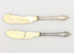 Käse & Buttermesser Anfang 20.Jhd., Silber 800/000, punziert: WB, Renaissanceornament, Klingen Stahl (leicht vergoldet), L = 19 cm
