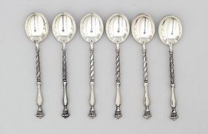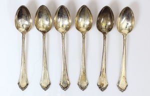 6 Kaffeelöffel JUGENDSTIL um 1900, WMF N, I/0, Entwurf ALBERT MAYER, versilbert, Monog: HB, L = 13,5 cm