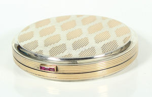 Puderdose um 1940/50, Silber 925/000, Boden und Deckel teilvergoldet, 3 synth. Rubine im Drücker, hochwertig verarbeitet, D = 77,5 mm H = 15 mm, total 94,6 g