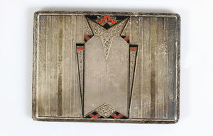 Zigarettenetui, ART-DECO um 1920, Silber 835/000 gepunzt "KS", graphisches Muster mit schwarzer und roter Emailleeinlage und kontrastreichem floralen Dekor, 109 x 82,5 x 9,5 mm, Drücker und Feder fehlen!