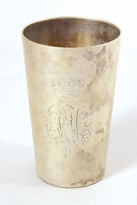 Becher vor 1900, Silber 800/000, gepunzt: WTB, Gravur: Krone u. Monogramm "JR" von HORN,, RV: M. Lindeck 19.11.97, D = 57,5 mm, H = 92,5 mm, 84,4 g
