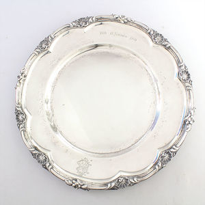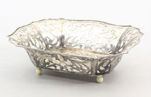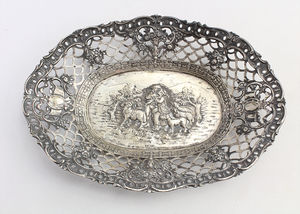 Schale für Gebäck, wohl HANAU, liebliche Schäferszene, Silber 800/000, umlaufender durchbrochener Rand mit floralen Elementen abgesetzt, B = 21 cm, total 158 g