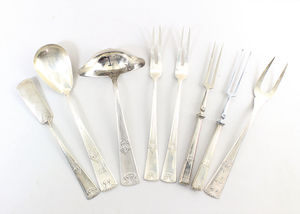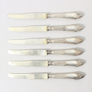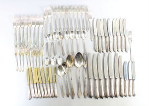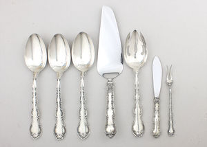 Essbesteck für 8 Personen, Amerika Anfang 20. Jhd., GORHAM, Sterlingsilber, je 8 Gabeln, Messer u. Löffel 17,2 - 23,5 cm; 16 Kaffeelöffel L = 15 cm; 8 Kuchengabeln, L = 16,3 cm, 3 Vorlegelöffel, L = 21,5 cm; 1 Vorleger durchbrochen, L = 21,5 cm; 1 Buttermesser, L = 16,7 cm, kl Gabel, L = 14,5 cm; 1 Kuchenheber, L = 27 cm, total ca.1,9 kg (ohne Messer)