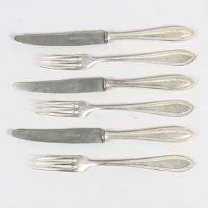 Obstbesteck, CBS, Versilb. 90; je 3 Messer u. Gabeln mit zartem Perlrand, L = 16,8 u. 14,5 cm, Monogramm: H E