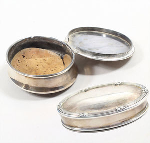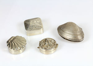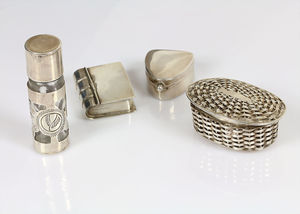 Lot: MEXICO, Silber, 925/000, 3 kl. Dosen ( 1 X Buch, 1 X Korb mit vier kl. Füßen, 1 x glatt); 1 kl. Fläschchen mit Schraubdeckel H = 54,5 mm