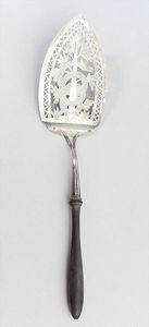 Fischtranchierbesteck um 1900, versilbert, gerillte Elfenbeingriffe, Klinge und Heber durchbrochen und graviert, L = 24 u. 32 cm