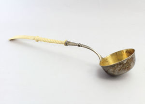Suppenkelle, DEUTSCH um1830, Silber, Kelle innen feuervergoldet, geschnitzter Griff aus Bein, L = 42 cm