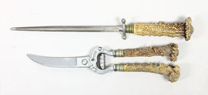 Jagdbesteck, Mitte 20. Jhd., Tranchierschere A.WINGEN & Jr. SOLINGEN und Wetzstahl DIAMANT, Griffe aus Hirschgeweih, L = 27,5 u. 33 cm