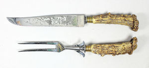 Jagd -Tranchierbesteck, 1960/70., sig: A.WINGEN & Jr. SOLINGEN, Tranchiergabel und Messer mit feiner Ätzung (Jagdmotive), teilweise farbig hinterlegt, Griffe aus Hirschgeweih, L = 28 u. 31 cm, hochwertige Ausführung