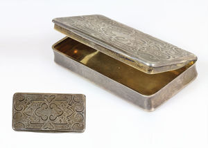 Dose um 1920, Silber 90%, wohl aus Vorderasien (englisch beeinflußt), die vier Füße sind zurückversetzt eingearbeitet, feine Drachenmotive in den Deckel eingearbeitet, innen feuervergoldet, 86 x 41,4 x 80,5 mm, gute Verarbeitung !