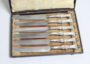 6 Frühstücksmesser, Süddeutsch um 1830/40 , Silber 13 Lot, L = 19,5 cm, Originalschatulle mit Goldaufdruck, innen mit Samt und Stoff bezogen, 1 Schließmechanismus fehlt