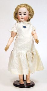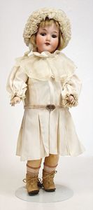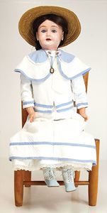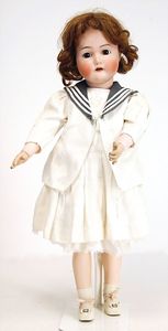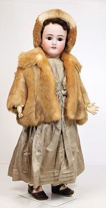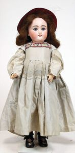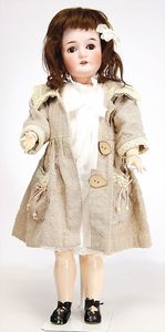 Heinrich Handwerk, Biskuitporzellankopf-Puppe, 66 cm, Kurbelkopf, braune Schlafaugen, off. Mund, oben Zähne, Kinngrübchen, Perücke u. Kleidung neuer, aufwendig genäht, Gliederkörper