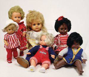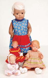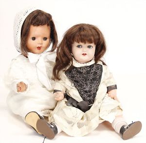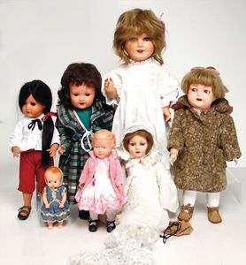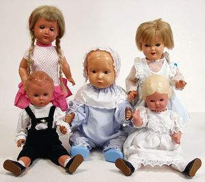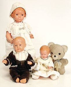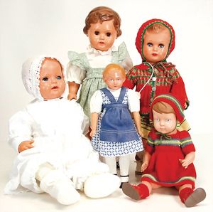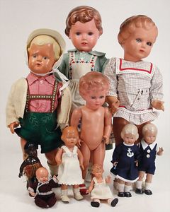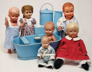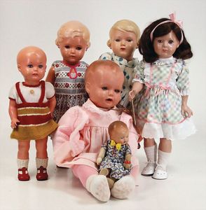 Konv. Puppen, Storch Mädchen, 35,5 cm, fester Kopf, blaue Schlafaugen, sehr guter Zust., 1 x Storch Mädchen, 31 cm, fester Kopf, gemalte Augen, Haarspange anmodelliert, 1 Celluloid-baby, Kurbelkopf, gemalte Augen, 1 Puppe wohl Tortulon, fester Kopf, ausmodellierte Haare, aufgemalte Schuhe u. Strümpfe,, 1 Babypuppe, Kunststoff, Mädchen wohl Tortulon, fester Kopf, gemalte Augen, anmodellierte Schuhe u. Strümpfe, ungemarkt