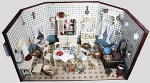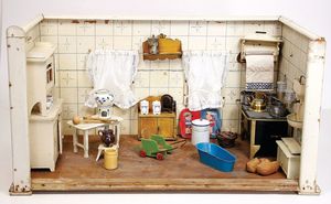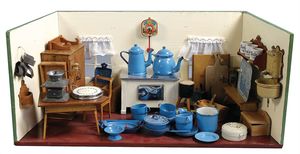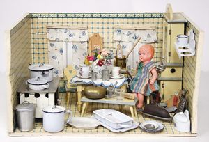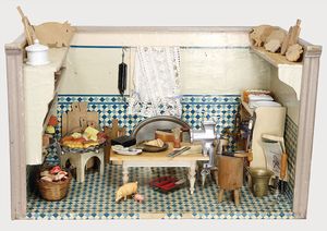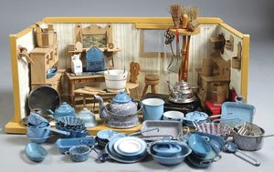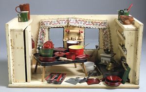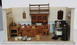 Puppenstubenküche, um 1900, 70 cm breit, 39 cm hoch, möbliert, mit Zubehör, mit Herd u. Zubehör