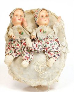 Zugspiel, Holz Korbgeflecht, 2 Papiermaché-Babys, 28 cm