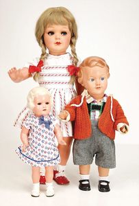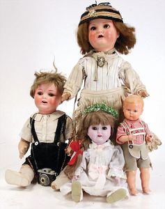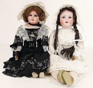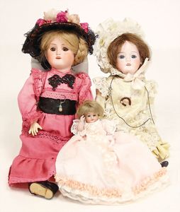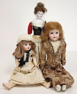 3 Teile Puppen, mit Biskuitporzellan-Köpfen, AM, 28 cm, braune fest eingesetzte Glasaugen, off. Mund, Zähne u. Zunge, Masse-Stehkörper, anmodellierte Schuhe u. Strümpfe, Perücke fest aufgeklebt, kl. Ganzbiskuit-Puppe, Kurbelkopf, Schlafaugen, Sitzbabykörper, 9 cm, 1 Biskuitpuppe 1909, braune fest eingesetzte Glasaugen, Echthaarperücke wurde nicht entfernt, off. Mund, Zähne oben, Gliederkörper, farblich überarbeitet
