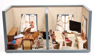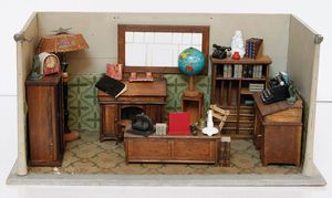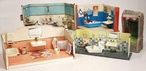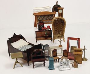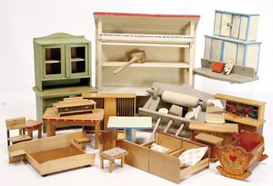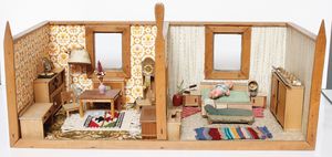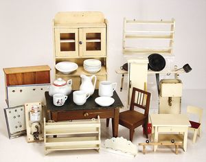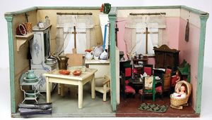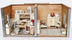 2-tlg. Puppenstube, mit Durchgangstür, 2 Fenster verglast, Länge 58 cm, Tiefe 37 cm, Höhe 32 cm, mit 1 Wohnzimmer-Möbelprogramm, Holz, Couch u. Stühle Stoff bezogen, dazu einige Teile Küchenmobiliar, darunter Bing Geschirrschrank, Gesamthöhe 28 cm, altersbed. kl. Lackabplatzer u. Roststellen, reichh. Zubehör, Keramikgeschirr, einige Teile Besteck