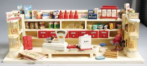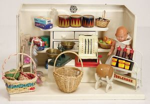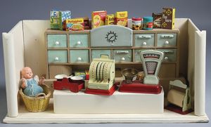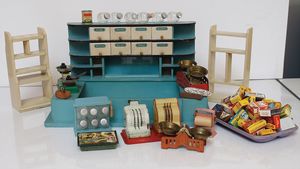 kl. Kaufladen, Blech Länge 39 cm, Tiefe 24 cm, Höhe 23,5 cm, mit 2 Regalen, 1 x mit Bonbongläsern, einige alte Blechdosen, kl. Körbe, Tellerwaage, dazu kl. Celluloid-Puppe von Cellba gem. 18