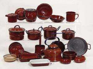 schönes Konv. Puppenküchenteile, Töpfe, Pfannen, Blech, braun emailliert, versch. Größen, bitte besichtigen