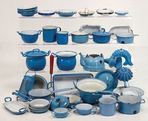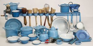 schönes Konv. Puppenküchengeschirr, Töpfe, Pfannen, Wasserkessel, Blech, blau/weiß emailliert, bitte besichtigen