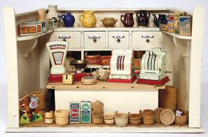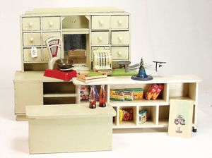 Kaufladen, mit fest eingebauten Regalen 4 Schubladen mit Porzellanschildchen, Länge 50 cm, Tiefe 31 cm, Höhe 31 cm, mit Blech Kaufladenkassen, 1 Waage, reichh. Zubehör an Pappschachteln, Keramikkrügen, Holztröge, u. anderes
