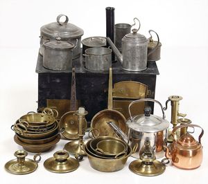 Puppenherd, Blech, Länge 23,5 cm, Höhe 13 cm, mit passenden Blechtöpfen, stärker bespielt, dazu schönes Konv. Messingschalen, versch. Durchm. einige Kerzenhalter, 1 Kupfer Teekessel