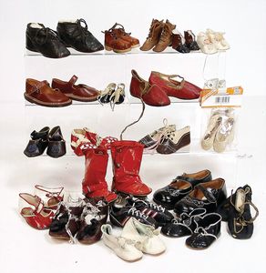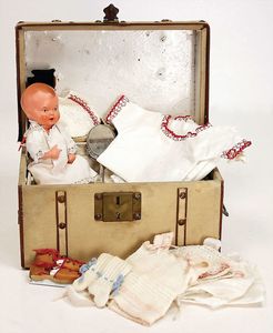 Puppentrousseau, mit einigen Teilen Weißwäsche, Strümpfe, f. kl. Puppe, 1 Paar Schlittschuhe, 2 Paar Puppenschuhe Wachstuch, Gr. 2, dazu 1 Schildkröt Strampelchen, fester Kopf, gem. 18 1/2/20