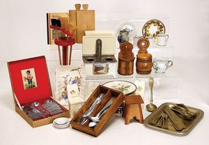 schönes Konv. , Puppenküchenzubehör, einige Besteckteile, versch. Gr., runder Besteckkasten, für 4 Personen, komplett, Salz- u. Mehlmetze, Holz, Besenständer, einige Teile Porzellan, schöne Tortenplatte, auf Fuß, Durchm. 11 cm, kl. Blechherd, 10 cm