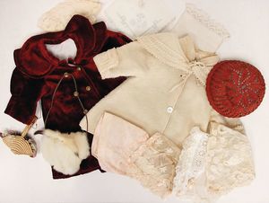2 Puppen-Mäntel, für ca. 50 cm Puppen, dazu 1 Paar alte Spitzendeckchen, 2 Spitzenhauben, 1 Pelzmuff