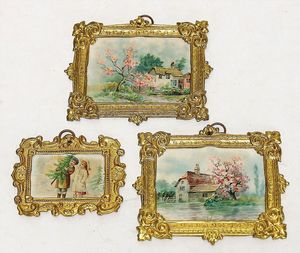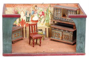 kl. Puppenstuben-Gehäuse, 33,5x20x17 cm, darin 2 Teile Mobiliar, Holz, Papier beklebt, Schrank Höhe 16 cm, kl. Kommode, Höhe 6,5 cm, 1 Stuhl, 1 kl. Blechkorb