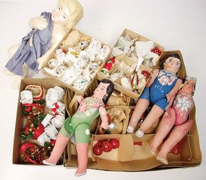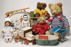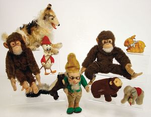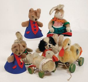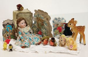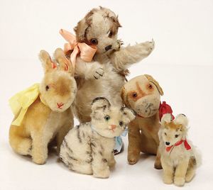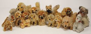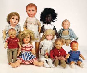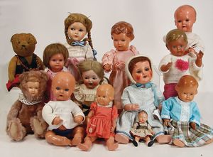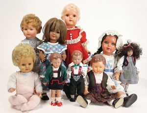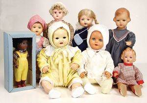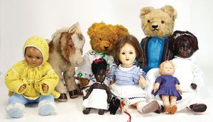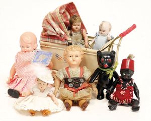 Konv. Masse-Puppen, Baby 48 cm, Mädchen, 43 cm, 1 Vinyl-Puppe, früh, 26 cm, kl. farbige Papiermaché-Puppe, seitlich blickend, 24 cm, farbige Puppe, König u. Wernicke 221/46, 2 Bären, Kunstplüsch, 2 Hunde, 1 Steiff Esel, später