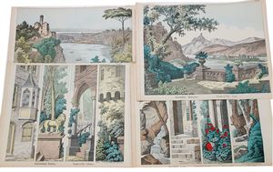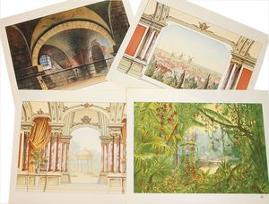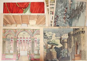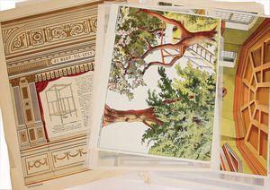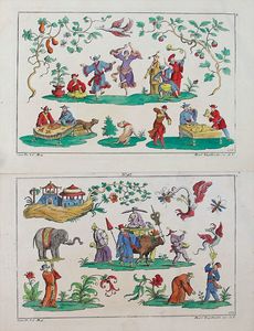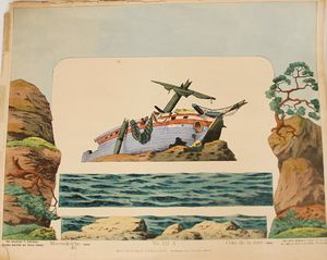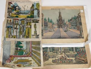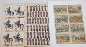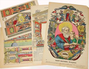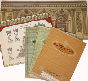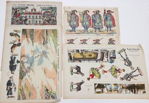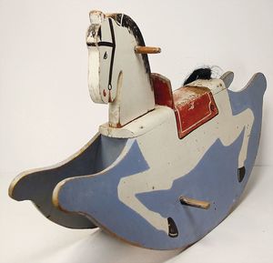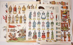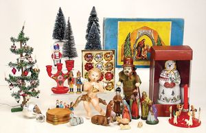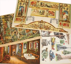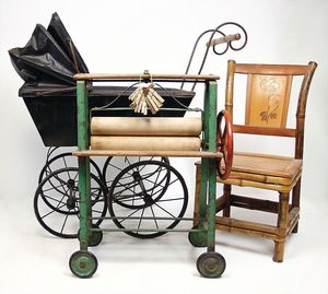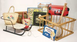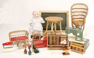 Konv. Puppendekoration, Baby, Korb, Geflecht, Stuhl, Spinnrad, einige Musikinstrumente