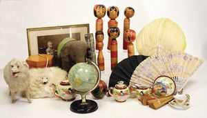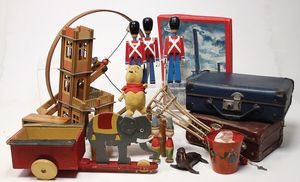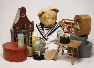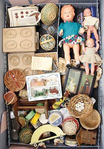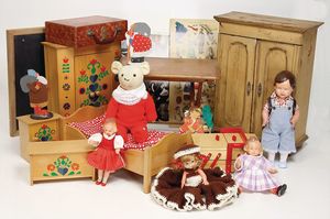 Fundkiste, Puppendekorationsstücke, Tisch, Bett, Schränke, Tafel, Koffer, Schildkröt Christel, Haare restauriert, 2 Puppen Kunststoff, 1 Bär, stark abgeliebt, einige Papierbögen, neuer