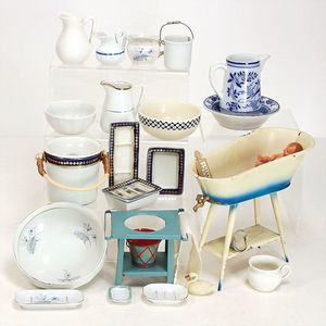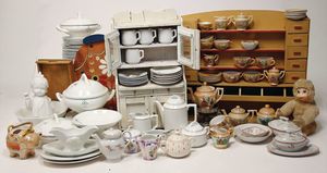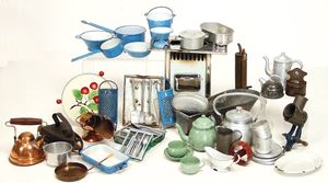 Konv. Puppenküchenteile, Porzellan, Blech emailliert, Weißblech, Holz, 20er-50er Jahre