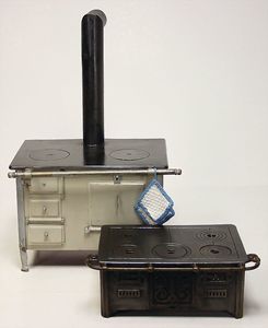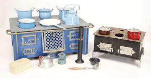 Konv. Puppenküchenteile, Herd, meist Blechteile, Blech emailliert, Blech lithographiert, Aluminium, für mittelgr. Küche