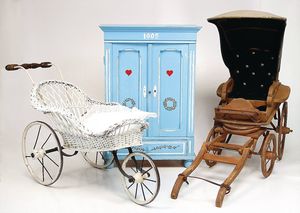 Konv. Puppendekorationsteile, Kutsche, Holz, Neuanfertigung im alten Stil, Kinderwagen Korb, Schrank, 1900, 1x überstrichen