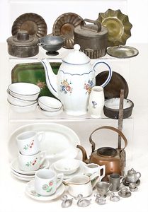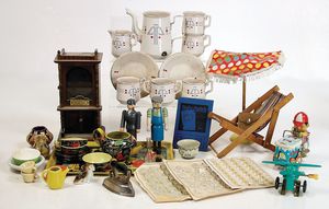 Konv. Puppenküchen-Zubehör, Porzellan, Service, Blechteile, darunter Blech Essensträger, einige Teile Kaufladen